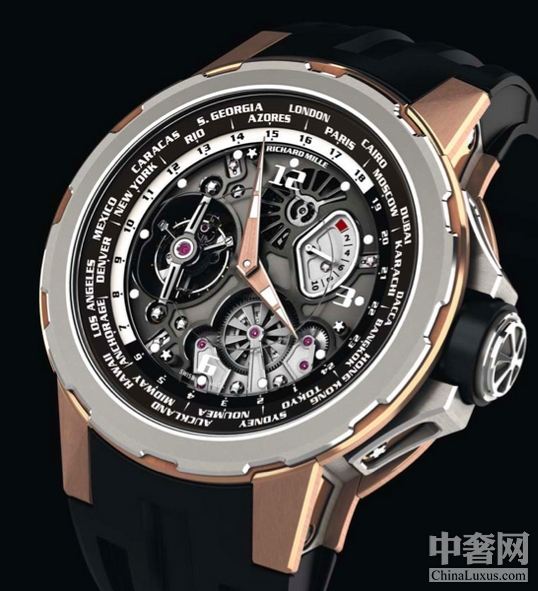 Richard Mille國(guó)際標(biāo)準(zhǔn)時(shí)陀飛輪腕表腕表簡(jiǎn)約大方的外觀下,其實(shí)暗藏著極端復(fù)雜的機(jī)械玄機(jī)。不同于其他擁有這項(xiàng)復(fù)雜功能的腕表,RM 58-01 沒有任何用來變更時(shí)區(qū)的按鈕。而是通過逆時(shí)針方向旋轉(zhuǎn)表圈來改變時(shí)區(qū),更快速地調(diào)整時(shí)間。到達(dá)一個(gè)新 的城市后,只需將該城市名稱旋轉(zhuǎn)到對(duì)準(zhǔn)12點(diǎn)位置,即可通過內(nèi)圈上的24小時(shí)刻度,自動(dòng)定義當(dāng)?shù)匾约捌渌?23個(gè)城市的時(shí)間。黑白雙色的圓盤清楚表示晝夜時(shí)間,并隨時(shí)間推移自動(dòng)呈現(xiàn)晝夜的變化。