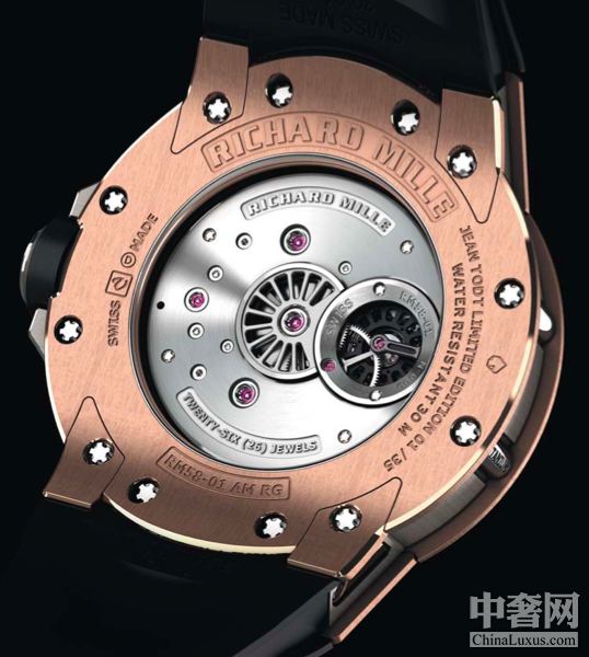 Richard Mille希望打造一枚容易使用的腕表。Richard Mille表廠眾多機(jī)芯與表殼工程師耗費(fèi)時(shí)日精心研究, 終于成就了這項(xiàng)偉大的革新之作,成功地將一個(gè)連接機(jī)芯的齒輪整合進(jìn)表圈之中,一方面讓兩個(gè)部件完美契 合,另一方面則因?yàn)闆]有按鈕的設(shè)計(jì),保證了腕表整體的防水性。